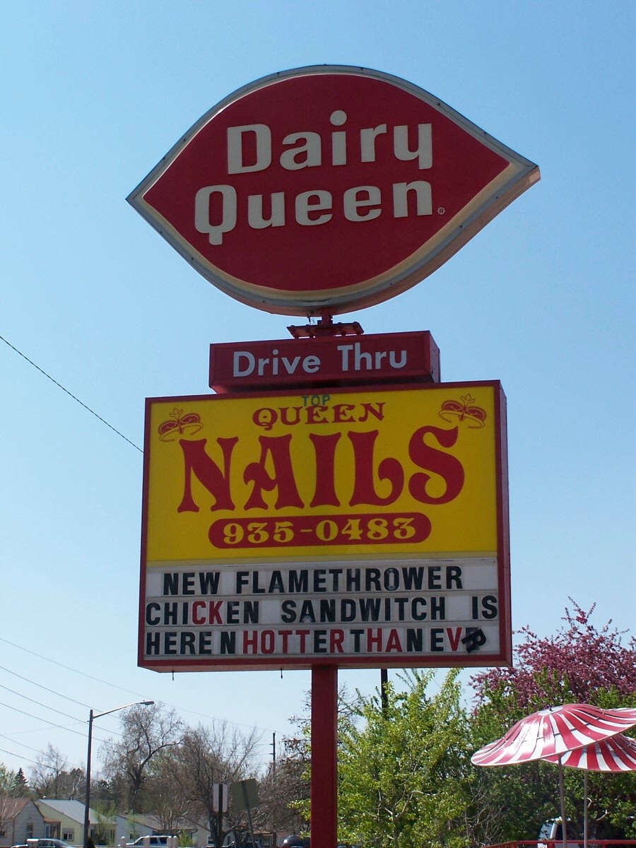 Here’s my proposed slogan (sorry, it’s bad, really bad): Sit a spell and get your nails done in the DQ Drive-Thru window. (Get it, “spell” from your sand “witch”?)